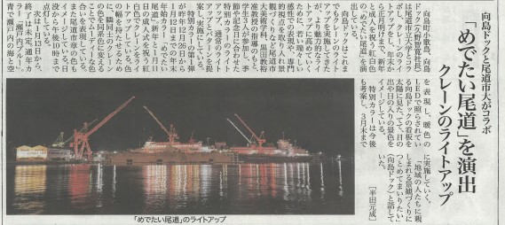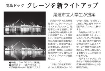 当社が実施している、尾道市立大学の学生提案によるクレーンの新ライトアップについて、このたび 日本海事新聞、海事プレス(海事プレス社)、尾道新聞 の各媒体にて紹介されました。