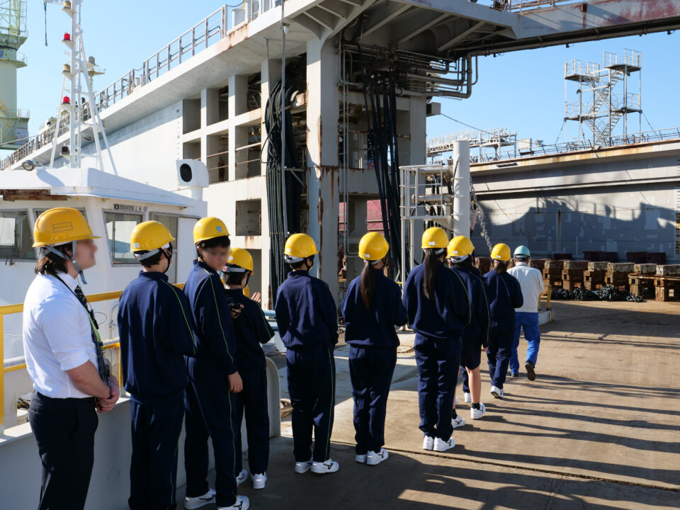 出前授業後、向島ドックへ移動し、工場を見学。普段は入ることのできない現場で、船の修繕の様子を見学していただきました。