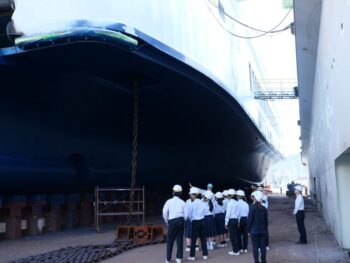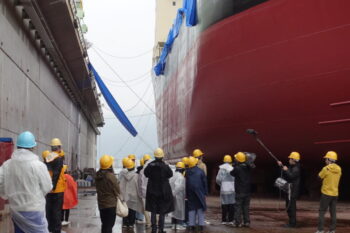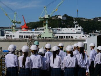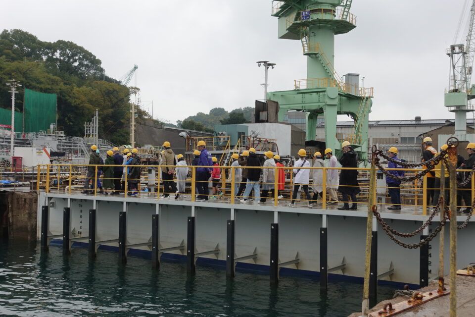 実際にドックや工場内を見学することで、座学では伝わりにくい巨大な船を間近で見る迫力や、現場で働く人々の活気を肌で感じていただけた様子でした。
