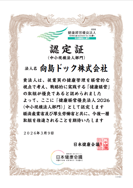 向島ドックでは、社員一人ひとりが健康でいきいきと働くことができる環境づくりを重要な経営課題の一つと捉え、健康づくりの取り組みを推進しています。今後も、社員の心身の健康保持・増進に努めるとともに、より働きやすい職場環境づくりを進め、健康経営のさらなる充実を目指してまいります。